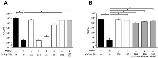 The culture supernatant of the Candida biofilm was centrifugally fractionated into solutions of <10 kDa and >10 kDa. Briefly, Candida supernatants were put into an ultrafiltration column (Amicon Ultra-4 10K, Merck KGaA) and centrifuged at 6000× g for 20 min. The flow-through solution was used as <10 kDa fraction, and the concentrate fraction inside the column was used as >10 kDa fraction. The >10 kDa fraction was diluted with RPMI 1640 supplemented with MOPS medium before use. E. coli biofilms were formed in the presence of each supernatant fraction and 50 μg/mL MEPM at 37 °C for 24 h. The control wells without supernatant fractions contained an equivalent amount of DMSO. The E. coli CFUs were counted as described above.