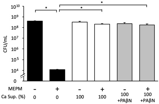 Effect of Candida culture supernatant (Ca Sup.) treated with drug efflux pump inhibitors on E. coli biofilm formation in the presence of MEPM. The drug efflux pump inhibitor PAβN was added to the supernatant. Measurements were performed three times, and the data are presented as the mean ± standard deviation. n = 3/group. Statistically significant differences between groups were evaluated using Tukey’s test with one-way ANOVA; * p < 0.05.