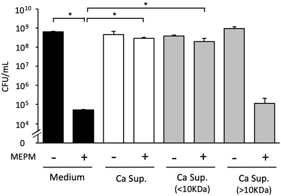 Effects of Candida culture supernatant (Ca Sup.) fractions on E. coli biofilm formation. The effects of supernatant fractions containing materials <10 kDa and >10 kDa in size in the presence of 50 μg/mL MEPM on E. coli survival. The measurements were performed three times, and the data are presented as the mean ± standard deviation. n = 3/group. Statistically significant differences between groups were evaluated using Tukey’s test with one-way ANOVA; * p < 0.05.