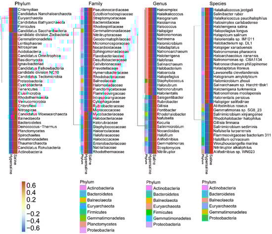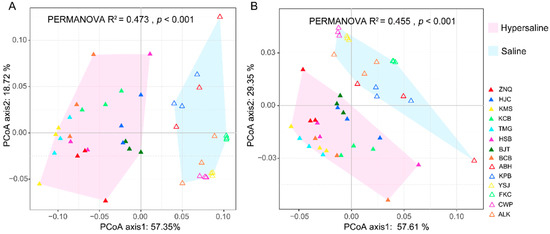 - Zhang, K.P.; Shi, Y.; Cui, X.Q.; Yue, P.; Li, K.H.; Liu, X.J.; Tripathi, B.M.; Chu, H.Y. Salinity is a key determinant for soil microbial communities in a desert ecosystem. Msystems 2019, 4, e00225-18. [Google Scholar] [CrossRef] [PubMed]