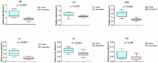 | Hypersaline | 8.41 ± 1.44 b | 70.53 ± 28.52 a | 8.04 ± 0.07 a | 6.59 ± 0.67 b | 0.35 ± 0.02 b | 0.49 ± 0.02 a | 130.05 ± 15.29 b | 1.16 ± 0.12 b | 6.74 ± 0.61 b |