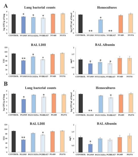 The analysis of the biochemical parameters evaluating lung tissue damage showed that NV1505, NVUCO25A and NVIBL027 were effective in protecting infected mice against the cellular damage and alveolar–capillary barrier alterations, since the levels of BAL LHD activity and albumin concentration were significantly lower compared to the control group. The three treatments were equally efficient at reducing BAL albumin values, while NV1505 was more effective than NVUCO25A and NVIBL027 at decreasing BAL LHD activity (Figure 1 A). The NV489 and NV576 treatments did not induce significant changes in the biochemical parameters of lung damage when compared with the control group (Figure 1A).