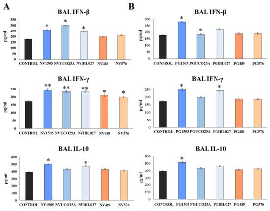 NV1505, NVUCO25A and NVIBL027 treatments were equally effective in increasing BAL IFN-β levels compared to the control group, while NV489 and NV576 did not induce significant changes in the concentrations of this cytokine. The five treatments increased BAL IFN-γ levels with respect to the control group. However, NV1505, NVUCO25A and NVIBL027 were more efficient than NV489 and NV576 to increase the concentration of IFN-γ in the respiratory tract during the secondary pneumococcal infection. On the other hand, only NV1505 and NVIBL027 increased the levels of BAL IL-10, while the remaining treatments did not induce significant differences with respect to the control group (Figure 2A). The concentrations of BAL IFN-β, IFN-γ and IL-10 were also evaluated for PGs treatments (Figure 2B). PG1505 and PGIBL027 were equally effective in increasing the levels of BAL IFN-β and IFN-γ compared to the control group, but only the PG1505 treatment increased BAL IL-10 levels. Of note, PGUCO25A, PG489 and PG576 did not induce significant modifications in the concentrations of BAL IFNs or IL-10 when compared to controls (Figure 2B).