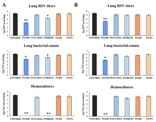 In all the experimental groups, RSV was detected in the lungs of infected mice (Figure 3). As we described previously [10], NV1505 and PG1505 were able to significantly reduce RSV titers in lungs of infected mice. Of note, among the other NVs treatments, only NVIBL027 reduced lung viral titers when compared to controls (Figure 3A). In addition, both NV1505 and PG1505 significantly reduced pneumococcal counts in lungs and prevented dissemination of the respiratory pathogen into the blood (Figure 3), which was in line with the results obtained in the poly(I:C) model (Figure 1). The NVIBL027 treatment was as efficient as the NV1505 treatment at reducing pneumococcal colonization and avoiding dissemination, but the PGIBL027 treatment did not induce significant differences with respect to the control group (Figure 3B). Treatment with the other NVs and PGs did not exert any protection against RVS primary infection or secondary pneumococcal pneumonia (Figure 3).