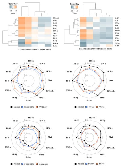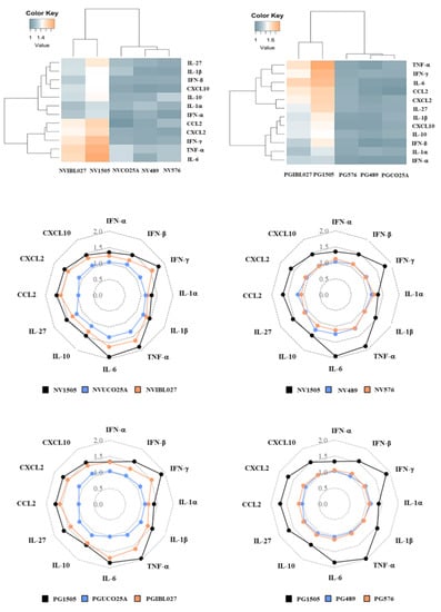 It was observed that in alveolar macrophages obtained from NV1505-treated mice the expression of all the factors analyzed (IFN-α, IFN-β, IFN-γ, TNF-α, IL-6, IL-1α, IL-1β, CCL2, CXCL2, CXCL10, IL-10 and IL-27) were significantly higher than controls. The NVIBL027 treatment increased all the cytokine mRNAs evaluated in proportions similar to those observed for NV1505, while NVUCO25A increased only the expressions of TNF-α, IL-6, IL-1α and IL-1β (Figure 5). Interestingly, it was observed that both PG1505 and PGIBL027 exerted similar modifications in cytokine profiles when compared to NV1505 and NVIBL027, respectively (Figure 5). In contrast, alveolar macrophages obtained from PGUCO25A-treated mice had no differences with controls when the inflammatory and regulatory cytokines expressions were compared. The treatments with NV489, NV576 or their peptidoglycans did not exert any significant change in alveolar macrophage cytokine profiles in response to bacterial infection when compared to controls (Figure 5). These differences were visualized in heat-map analysis; PG1505 and PGIBL027 clustered separately from the other treatments (Figure 5).