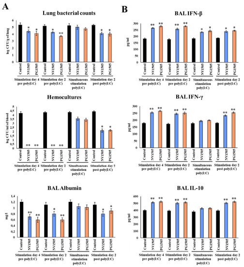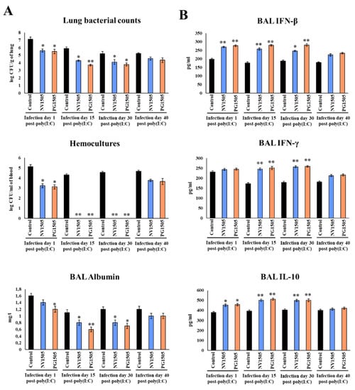 When the NV1505 and PG1505 treatments were administered 2 days after the challenge of poly(I:C), the lung pneumococcal counts and BAL albumin concentrations (Figure 7A), as well as the BAL IFN-γ and IL-10 levels (Figure 7B), were modulated with a similar magnitude as that observed in mice treated with NV1505 and PG1505 4 or 2 days before poly(I:C) stimulation. Of note, although the blood pneumococcal cell counts were reduced and the BAL IFN-β levels were increased, the values of those parameters did not reach the levels found in the groups of mice treated with NV1505 and PG1505 4 or 2 days before poly(I:C) stimulation (Figure 7).