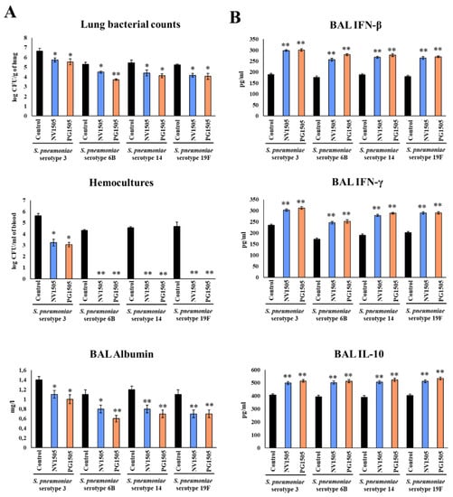 Finally, we investigated the capacity of NV1505 and PG1505 to protect against secondary pneumococcal pneumonia produced by different S. pneumoniae serotypes. For this purpose, infant mice were nasally treated with NVs or PGs, stimulated with poly(I:C) and then challenged with S. pneumoniae serotypes 3, 6B, 14 or 19F. Two days after pneumococcal challenge, lung and blood bacterial cell count, biochemical markers of lung injury and respiratory cytokines were evaluated (Figure 8). In our tests, the administration of both NV1505 and PG1505 were effective in reducing S. pneumoniae counts in lung and blood, diminishing BAL albumin and improving BAL IFN-β, IFN-γ and IL-10 for serotypes 14 and 19F (Figure 8), doing so as efficiently as observed with serotype 6B (Figure 1) [10]. Interestingly, the NV1505 and PG1505 treatments were as effective in increasing the levels of BAL IFN-β, IFN-γ and IL-10 in mice infected with S. pneumoniae serotype 3 as observed in the other pneumococcal serotypes (Figure 8B). However, although these treatments reduced the pathogen counts in lung and blood as well as BAL albumin in comparison to controls, the values of the three parameters were higher than those observed in NV1505- and PG1505-treated mice infected with serotypes 6B, 14 or 19F (Figure 8).