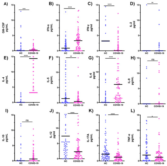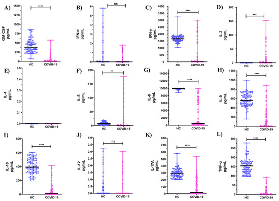 Cytokine profiles in serum samples from healthy subjects and patients in the COVID-19 intensive care unit (A–L). * p < 0.05, ** p < 0.01, *** p < 0.001, **** p < 0.0001 refers to the statistical differences. HC: healthy controls; ns: not significant.