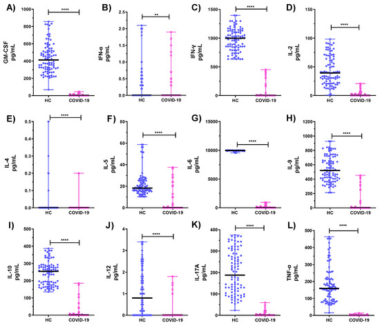 Significantly lower mean values were observed in the cytokine production profiles of PHA-stimulated PBMCs for GM-CSF, IFN-γ, IL-6, IL-9, IL-10, IL-17A, and TNF-α when compared to HC (Figure 1A,C,G–I,K,L, p < 0.0001). On the other hand, higher mean levels of IL-2 (Figure 1D, p < 0.001) and IL-5 (Figure 1F, p < 0.01) were produced by PHA-stimulated PBMCs from COVID-19 ICU patients compared to HC. No statistically significant differences were found in the levels of IFN-α, IL-4, and IL-12 of PHA-stimulated PBMCs compared with the HC group (Figure 1B,E,J, p > 0.05).