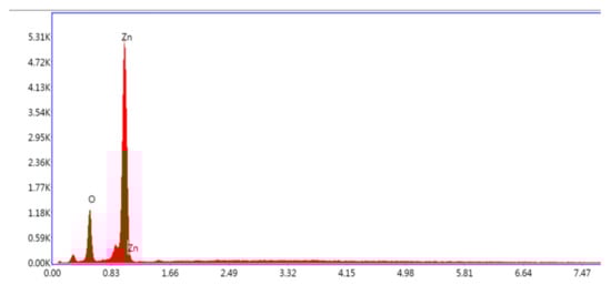 For energy dispersive X-ray (EDX) analysis, the particles were dried on a carbon-coated copper grid and the analysis was performed on the SEM instrument equipped with aThermoEDX attachment. The EDX analysis spectrum indicated the formation of ZnO NPs.