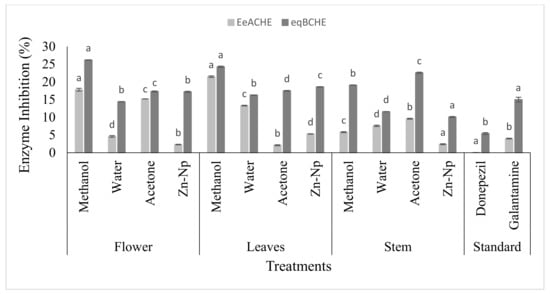 Figure 5. In vitro AChE and BChE inhibitory activities of Calotropis gigantea extracts and zinc nanoparticles. Bars with different letters are significantly different from each other (p < 0.05).