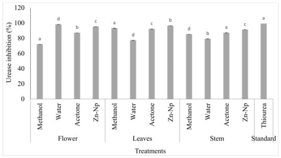 Figure 6. In vitro urease inhibitory activity of Calotropis gigantea extracts and zinc nanoparticles. Bars with different letters are significantly different from each other (p < 0.05).