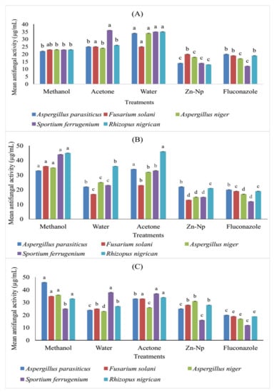 Figure 7. Comparison (MICs) in (µg/mL) different concentrations offlower (A), leaf (B), and stem (C) extracts of C. gigantea along with nanoparticles against selected fungal strains. Bars with different letters are significantly different from each other at p = 0.05.