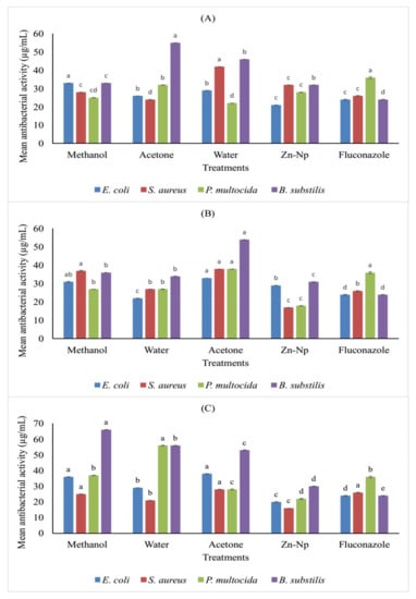 Figure 8. Comparison (MICs) in (µg/mL) different concentrations offlower (A), leaf (B), and stem (C) extracts of C. gigantea along with nanoparticles against selected bacterial strains. Bars with different letters are significantly different from each other at p = 0.05.