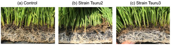 The roots of the rice seedlings before planting in the paddy field (1 month after sowing). (a) Control without bio-priming, (b) bio-primed with strain Tsuru2, (c) bio-primed with strain Tsuru3.