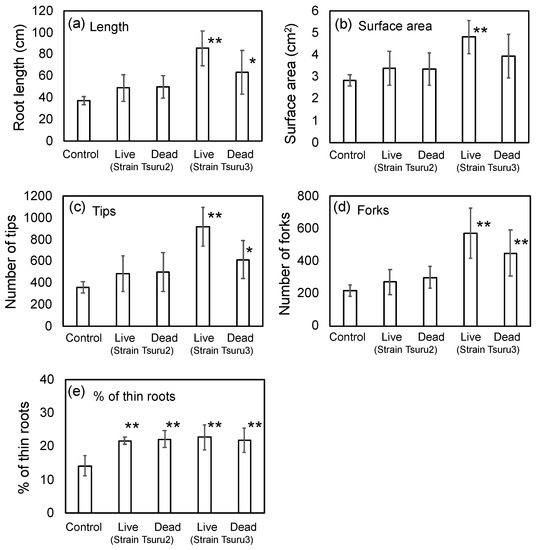 Effect of bio-priming by strains Tsuru2 (live and dead) and Tsuru3 (live and dead) on (a) root length, (b) surface area, (c) number of tips, (d) number of forks, and (e) % of thin (0.1 mm < diameter) roots. The rice seeds were bio-primed by PNSB for 24 h, sown onto a cell pot and cultivated for 14 days. Data are means ± SD (n = 5). An asterisk indicates the result that was significantly different (* p < 0.05, ** p < 0.01) from the control.