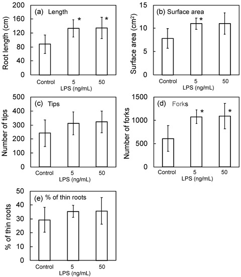 Effect of bio-priming by LPS of R. sphaeroides NBRC 12203T on (a) root length, (b) surface area, (c) number of tips, (d) number of forks, and (e) % of thin (0.1 mm < diameter) roots. The rice seeds were bio-primed by LPS solution for 24 h, sown onto a cell pot and cultivated for 14 days. Data are means ± SD (n = 5). An asterisk indicates the result that was significantly different (* p < 0.05) from the control.