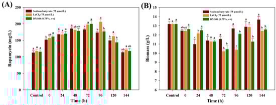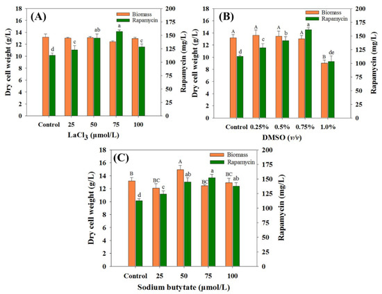 Effects of chemical elicitors on biomass and rapamycin yields. (A) Dimethyl sulfoxide (DMSO), (B) LaCl3, (C) sodium butyrate (SB). The final biomass and rapamycin contents were determined after seven days of fermentation. The significant difference levels (p < 0.05) of biomass and rapamycin contents among the different concentrations of each chemical elicitor were marked with uppercase (biomass, e.g., A, B, C) and lowercase (rapamycin, e.g., a, b, c) letters, respectively.
