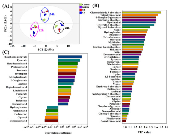 PCA and PLS-DA analyses of intracellular metabolites under different chemical elicitor treatments. Compared with the control, DMSO, SB, and LaCl3 were added into the medium at 72 h of the batch fermentation, respectively. After an additional 12 h, 24 h, and 48 h of culture, intracellular metabolites of each sampling time point were analyzed by different multivariate statistical analysis methods, respectively. (A) PCA-derived score plots; (B) VIP score plot derived from PLS-DA analysis; (C) the metabolites correlated with rapamycin using PLS-DA.