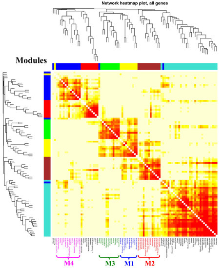 - Pei, G.; Chen, L.; Zhang, W. WGCNA application to proteomic and metabolomic data analysis. Methods Enzymol. 2017, 585, 135–158. [Google Scholar]