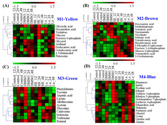 Heat map analysis of the metabolites identified in each distinct metabolic module of WGCNA analysis. (A) The metabolic module (M1) showed a highly positive association with DMSO; (B,C) the metabolic modules (M3 and M4) showed a highly positive association with sodium butyrate (SB); (D) the metabolic module (M4) showed a highly positive association with LaCl3.