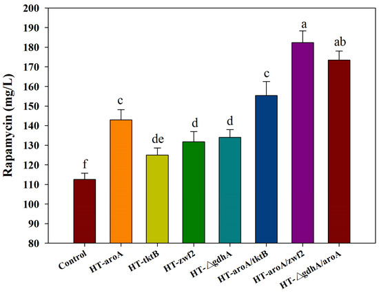 The effect of the single (or multiple) gene manipulation on rapamycin production. aroA: 2-dehydro-3-deoxyphosphoheptonate aldolase; tktB: transketolase; zwf2: glucose-6-phosphate 1-dehydrogenase; gdhA: glutamate dehydrogenase (NADP+). The significant differences (p < 0.05) of rapamycin yields were marked with the lowercase letters among the different strains.