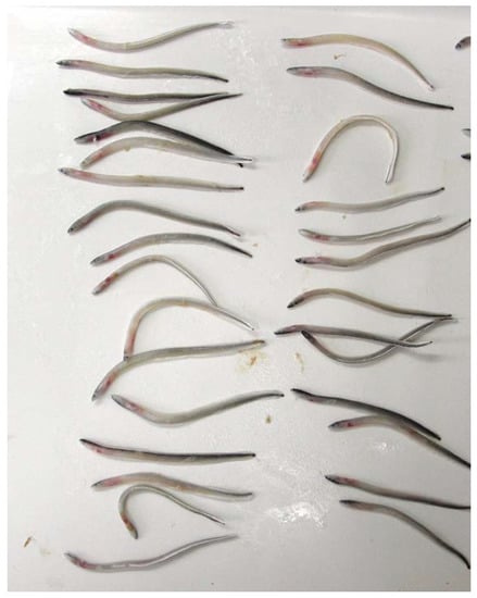 European eel (A. anguilla) and Japanese eel (Anguilla japonica) are traditional culinary delicacies consumed primarily in Asia and, to a lesser extent, in European countries []. Although some progress in the artificial reproduction of eels has been achieved [], it is not yet possible on a commercial scale. Therefore, all market demands are supplied on catches of wild glass eels or elvers for aquaculture production and conservation []. In Europe, A. anguilla is produced in intensive recirculation systems with a regulated water temperature [].