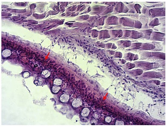 During quarantine at the city zoo, increased mortality was noted, and laboratory analysis revealed the presence of eel virus European X (EVEX), one of the three major viruses in farmed and wild European eels [,]. Necropsy showed haemorrhages in the skin of analysed glass eels (Figure 1) and supported the pathology described previously [,]. This finding was confirmed histologically (Figure 2) though other histopathological changes were not pronounced to a level that would cause mortality. Therefore, we could assume that crowding in the transportation bags and placing glass eels in zoo tanks induced stress, likely causing favourable conditions for virus multiplication and disease manifestation. A similar scenario was previously described in Atlantic salmon [].