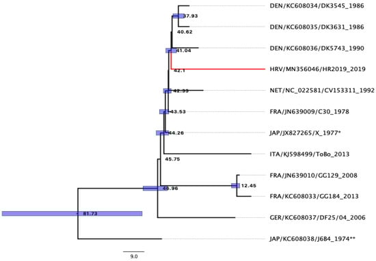 Results obtained using Bayesian phylogeny showed that AICM was lowest when using the substitution model GTR [], with sites set to be estimated with four categories of gamma-distributed rate heterogeneity and a proportion of invariant sites GTR (GTR + Г4 + I) for complete sequence, and partitions with codon model YANG96 [] using an uncorrelated relaxed lognormal Coalescent Bayesian Skyline model. The most common ancestor to the Croatian strain HR2019 (accession number MN356046) was the Danish strain before 41.04 y (95% HPD 38.67–43.32 y, PP 0.98) and likely evolved from the French strain C30 (KC608036) from 1978. Taxa names consisted of the following information: “Country of origin 3digit code/sequence accession number/strain name _year of isolation”.