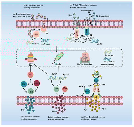 Flagella, the important rotational propulsive organelles of Salmonella, play an important role in the adhesion and invasion of host cells, which contribute to Salmonella infection. The reduced expression of sdiA can decrease flagella formation (motility) and fimbria formation through affecting the expression of virulence factors controlled by QS, such as pefI/srgC operon, srgE, and sirA [53,54,55]. Additionally, it has been reported that the AI-2-mediated QS system affects Salmonella flagellum formation which contributes to its virulence [35]. The expression of luxS and fliC decreased which influences the expression of flagella. It causes a reduction in Salmonella motility and affects the pathogenicity of Salmonella. Furthermore, it has also been shown that overexpression of LsrR, a repressor which regulates and controls various genes in response to AI-2-P, in Salmonella substantially reduces the expression levels of fliC, fliD, as well as flgL, which have a critical function in flagellar formation and motility [5,22,35]. In addition, LsrK, the AI-2 kinase, plays an essential contribution to the regulation of flagellar photosynthesis and motility processes in Salmonella [35]. In the AI-3, Epi, and NE-mediated QS, various signaling molecules act as a global regulator of virulence by activating the expression of genes involved in flagellar biosynthesis and bacterial motility [56]. In indole-mediated QS, the signaling molecules of indole can inhibit bacterial flagella biosynthesis by reducing the expression of flhC, a major regulator of Salmonella flagellar biogenesis, which leads to decreased Salmonella motility [25]. In conclusion, different signaling molecules, mediated QS systems, decrease or increase the motility of Salmonella by affecting its flagella, which contributes to its virulence.