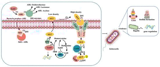 The quorum sensing (QS) system is an intercellular cell–cell communication mechanism that coordinates bacterial adaptation to the environment. Many bacteria can produce and release QS molecules into the environment, which allows bacteria to respond to their own and environmental conditions by receiving signal molecules from the environment and themselves [8]. With a threshold concentration of QS molecules reached, the receptor protein interacts with the QS molecules which induces a signaling pathway that consequently modulates cellular metabolic processes in response to environmental changes. QS affects the biosynthesis and assembly of pef fimbria by regulating the expression of Salmonella (the resistance to complement killing) rck locus [9]. The cellular processes are associated with bacterial virulence and survival of bacteria in their environment [10,11], such as biofilm formation, flagellar-mediated motility, adhesion and invasion, andT3SS [9,12]. Consequently, inhibition of Salmonella QS has become a new and promising antibacterial strategy, which not only resists Salmonella virulence but also prevents the development of bacterial resistance. In this article, we described the formation of different QS in Salmonella, discussed regulatory mechanisms between QS and Salmonella virulence, and focused on a new strategy for using the QS system to combat Salmonella infection. Such a strategy may have the potential to be a promising next-generation therapy to control Salmonella infection and tackle the development of antibiotic resistance.