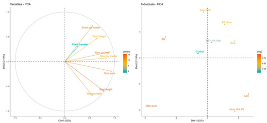 In the principal component analysis, the Azw + IAA BS treatments had a positive correlation with the parameters root number, root length, root area and root volume. The Azw, BS + IAA Azw, BS + IAA Azw, BS + Azw, and Azw + Azm treatments had a positive correlation with the parameters plant height and root diameter (Figure 2).