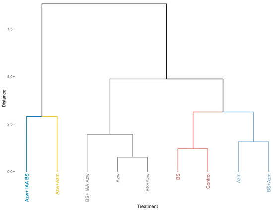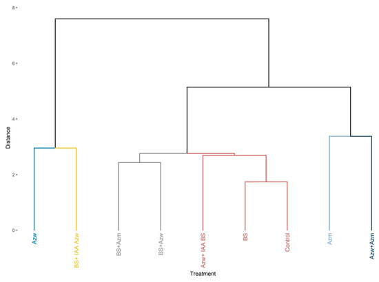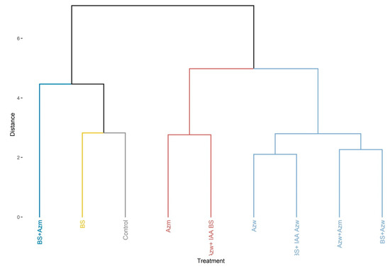 In the hierarchical clustering analysis, the Azw + IAA BS and Azw + Azm treatments were the most distinct compared to the other treatments (Figure 6).