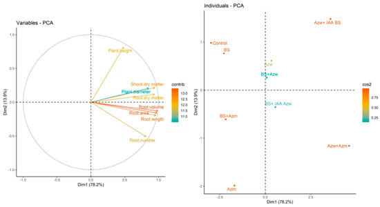 The principal component analysis shows that the Azw treatment had a positive correlation with the parameters number of roots, root length, and root area and that the Azw + IAA BS and BS + IAA Azw treatments had a positive correlation with the parameter plant height.), root dry mass, root volume, shoot dry mass and plant diameter (Figure 8).