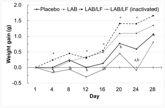 Growth curve (weight gain) in diet-induced obese (DIO) mice treated with three types of probiotic mixture. The treatment groups are detailed in the legend of Table 1. Briefly, DIO mice were fed with a high-fat diet and further supplemented with one of three probiotic mixtures by oral gavage daily for about four weeks. The mice were weighed twice a week during the study. The data represent group means. * The weight gains of LAB/LF mice were significantly higher than that of the placebo group. a The weight gains of LAB/LF (inactivated) mice were significantly lower than that of the placebo group. b The weight gains of LAB/LF (inactivated) were significantly lower than that of the LAB/LF group.