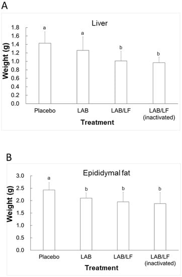 After four weeks of supplementation with four treatments, the DIO mice were sacrificed, and their livers, kidneys, and epididymal fat were weighed (Figure 1). The liver weights (Figure 2A) in the LAB/LF and inactivated LAB/LF groups were significantly lower than those in the placebo and LAB groups (p < 0.05). However, there were no significant differences in the liver weights between the placebo and LAB groups of mice, and the liver weights were not statistically different between the LAB/LF and inactivated LAB/LF groups of mice. Moreover, the weight of epididymal fat in the LAB, LAB/LF, and inactivated LAB/LF groups was not statistically different, but the weight of epididymal fat in the three supplement groups was statistically lower than that in the placebo control (p < 0.05). Collectively, these data indicate that both live and inactivated LAB/LF supplementation could contribute to reducing the liver weight in obese mice, and all three probiotic supplements could contribute significantly to decreasing the epididymal fat of obese mice.
