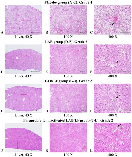 Representative images of histopathological examinations of the liver in DIO mice treated with a placebo or one of three probiotic mixtures. The groups are defined and explained in the legend of Table 1. Livers showed multifocal and severe fatty changes in the microvesicles and macrovesicles (arrow), which were graded severe/high in the placebo ((A–C), Mouse A2), and moderate in the LAB ((D–F), Mouse B5), LAB-LF ((G–I), Mouse C6), and inactivated LAB/LF ((J–L), Mouse D3) groups. Liver sections were stained with H & E; images at 40×, 100×, and 400× magnification are shown. Grade 4 fatty infiltration was observed in most mice in the placebo control group, while Grade 2 fatty infiltration was often observed in the mice fed with the LAB, LAB/LF, or inactivated LAB/LF supplements.