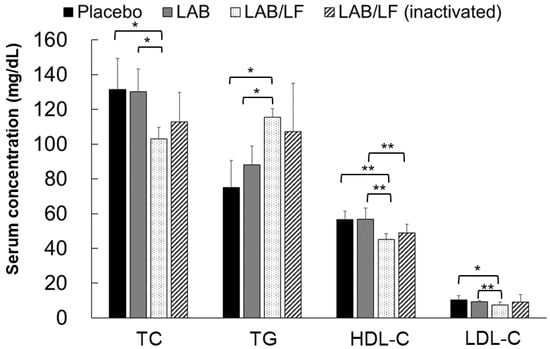 The serum lipid profiles of the four treatments are shown in Figure 5. According to the previous reference level of serum TC in healthy mice (69.5–150.6 mg/dL) [], the TC levels in the four groups of mice were still within the normal range. Moreover, there was no statistically significant difference in the TC level among the placebo, LAB, and inactivated LAB/LF groups of mice. However, the TC levels in the LAB/LF group were significantly lower than those in the placebo and LAB groups (p < 0.05). According to the reference values for serum TC levels developed by the National Laboratory Animal Center (Taipei, Taiwan), the serum TC level in healthy C57BL/6JNarl mice is about 117.54 ± 7.86 dL. Thus, according to that reference, serum TC levels in the placebo and LAB groups exceeded the normal range, but the mean TC levels were only slightly higher than the reference values in the inactivated LAB/LF group, while they were within the normal range in the LAB/LF group. Collectively, these findings suggest that LAB/LF supplements could help to slightly reduce the serum TC levels in DIO mice.