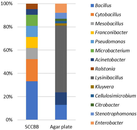 To assess the cultivation bias of the SCCBB method, we isolated twenty-one potential biosurfactant-producing bacterial strains from a petroleum-contaminated soil sample using this method. These strains belonged to eight genera (Figure 3). As a comparison, strains were also isolated from the same sample using a traditional agar plate [25]. Sixty-two colonies were picked from the agar plate and could be assigned to eight genera (Figure 3). We compared the taxonomic distribution of the isolates from both two methods. The results indicated that isolates from SCCBB methods showed higher evenness than those from the agar plate. About 58% of the total number of strains from the agar plate belonged to the genus Lysinibacillus. Moreover, using the agar plate method, we failed to isolate strains belonging to the genus Pseudomonas, which are well-known biosurfactant-producing bacteria. It has been reported that the genus Lysinibacillus is fast-growing, stress-tolerant, and can induce the abnormal biofilms of other species by signaling molecules [30,31,32]. Consequently, strains with higher growth fitness, such as Lysinibacillus, tend to be over-represented in culture conditions, suggesting that differences in growth fitness can lead to a cultivation bias when using the agar plate method.