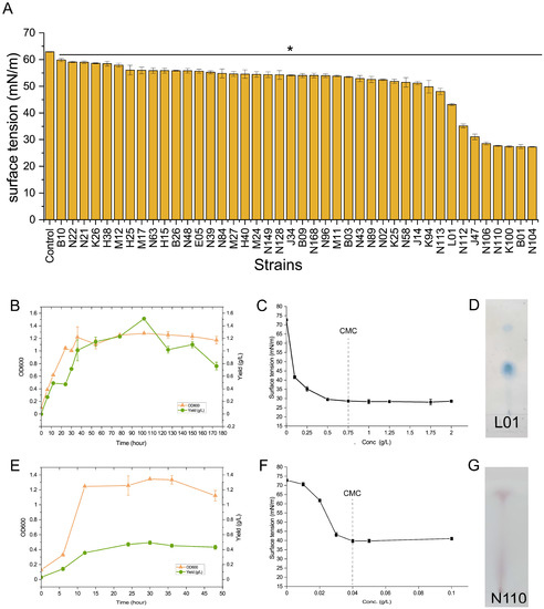 Functional verification of the representative strains isolated using the SCCBB approach. (A) The surface tension of the culture suspensions. * p < 0.05 relative to the culture medium by Student’s t-test. (B) Growth and yields of crude biosurfactants produced by Pseudomonas sp. L01. (C) Surface activities of the crude biosurfactants produced by L01. (D) Thin-layer chromatography (TLC) analysis of the crude biosurfactants produced by L01. The band indicates the presence of glycolipids with the anthrone-sulfuric acid reagent. (E) Growth and yields of crude biosurfactant produced by Bacillus sp. N110. (F) Surface activities of the crude biosurfactants produced by N110. (G) TLC analysis of the crude biosurfactants produced by N110. The band indicates the presence of lipopeptides with ninhydrin solution in acetone.