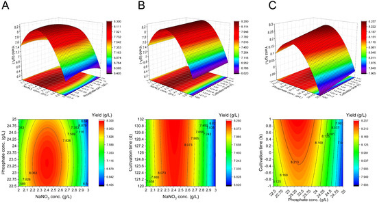 Three-dimensional surface and contour plots showing the interactions of factors on the biosurfactants yield. (A) Interactions between NaNO3 concentration and PO43− concentration (B) Interactions between NaNO3 concentration and cultivation time. (C) Interactions between PO43− concentration and cultivation time.