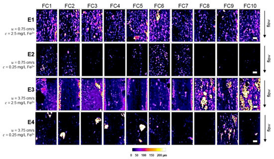 Figure 1 reveals biofilm growth in all flow cells (FC). It is worth noting that FC 9 of E4 had a different appearance among the other flow cells for these experimental conditions. Visible similarities were observed for E3 in flow cells FC 5 to FC 8 and FC 10, respectively. Experiment E1 ( = 2.5 mg/L Fe2+, = 0.75 cm/s) led to biofilms with a mean biofilm thickness = 75 µm in all replicates. Additionally, under condition E1, biofilm aggregates of up to 200 µm were established and the substratum was covered with heterogeneous aggregates, ranging from smaller and spherical colonies to longer (>2 mm) and elliptic colonies. In experiment E2 ( = 0.25 mg/L Fe2+, = 0.75 cm/s) less biofilm developed: only flow cells FC 1, FC 2 and FC 5 to 7 were covered with biofilm ( = 50 µm). In comparison to E1, biofilm growth within E2 was delayed and only small colonies of minor widths and lengths, as well as of minor heights, accumulated. In E3 ( = 2.5 mg/L Fe2+, = 3.75 cm/s) in turn, the biofilm appeared dense at day 10 of the cultivation. Similar to E2, bacterial colonization was first visible around days 3 and 4. Here, accretion within the flow chamber took place from the walls to the center of the FC. In E4 ( = 0.25 mg/L Fe2+, = 3.75 cm/s), coverage of the substratum was again low as in E2 and only a few colonies randomly developed with high biofilm thicknesses of = 200 µm.