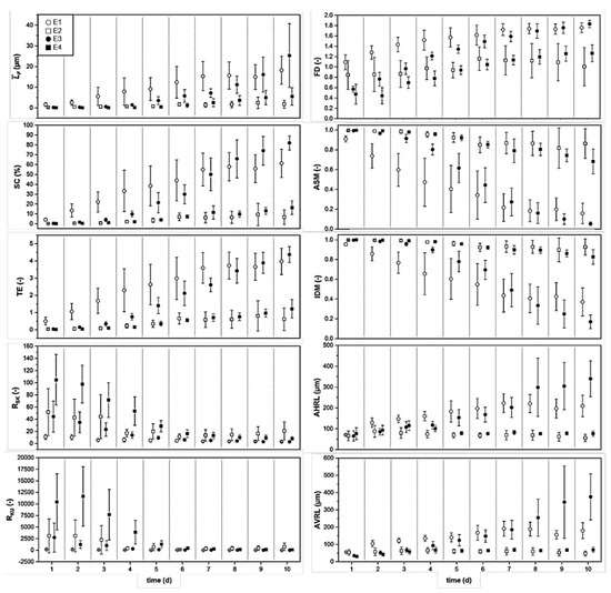In Figure 2, the development of these 10 different structural biofilm parameters for all conditions E1–E4 is illustrated. Their meaning is explained in Table 2. As already visible in Figure 1, the effect of the high (E1 + E3, = 2.5 mg/L Fe2+) and the low iron(II) concentrations (E2 + E4, = 0.25 mg/L Fe2+) is visible. While mean biofilm thickness and substratum coverage of E1 and E3 showed a steady increase until the end of the experiment, those parameters stayed at a minimum level in E2 and E4. A similar trend was distinct for the parameters including textural entropy , average horizontal and average vertical run length . Additionally, the stated parameters of E3 ( = 2.5 mg/L Fe2+, = 3.75 cm/s) exceeded those of E1 ( = 2.5 mg/L Fe2+, = 0.75 cm/s) at the end of the experiment (from day 8 to day 10). The same trend was shown for biofilms grown with = 0.25 mg/L Fe2+, whereas the structural parameters in E4 ( = 3.75 cm/s) exceeded those of E2 ( = 0.75 cm/s). While mean biofilm thickness and substratum coverage indicated an early accumulation of biofilms with high biofilm volume in E1 and E3 ( = 2.5 mg/L Fe2+), higher values of textural entropy exhibited more heterogeneous biofilms. Thus, biofilms grown with 2.5 mg/L Fe2+ showed more differentiated and partially distributed structures. Furthermore, average run lengths and of biofilms in E1 and E3 displayed longer and wider biofilm aggregates resulting in the largest aggregates regarding biofilm volume in E3 ( = 2.5 mg/L Fe2+, = 3.75 cm/s) (compare Figure 1).