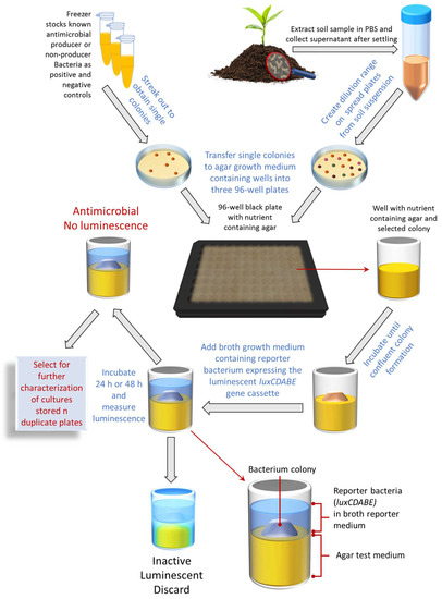 Although successful, the methods used by Waksman and many others at the time were tedious and time-consuming [17]. These methods are still used today due to the lack of natural product screening methodology development especially compared to their synthetic counterparts. Therefore, we developed a novel up-to-date assay for the rapid early identification of antibacterial-producing soil bacteria called the bioluminescent simultaneous antagonism (BLSA) assay (Figure 1). The BLSA assay layout is simple and requires only general laboratory equipment and visual and/or basic analyses to interpret the results. An important novelty of our BSLA assay is that it can be scaled up to be incorporated into automated liquid handling systems for HTS. The BLSA assay entails the co-culturing of a test bacteria together with an autonomous bioluminescent reporter bacterium constitutively expressing an integrated luxCDABE gene cassette from Photorhabdus luminescens. The luxAB genes encode the α and ß subunits of luciferase which catalyzes the oxidation of reduced flavin mononucleotide (FMNH2) and fatty aldehyde synthesized by the fatty acid reductase complex encoded by the luxCDE genes, resulting in the emission of blue-green light [18]. Upon cell death, the concentration of FMNH2 drops almost instantaneously, allowing for accurate monitoring of cell death by loss of luminescence [19,20,21,22]. Therefore, reporter bacterium bioluminescence is utilized for cell viability assessment to indicate the presence or absence of antibacterial compounds.