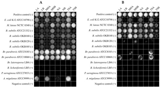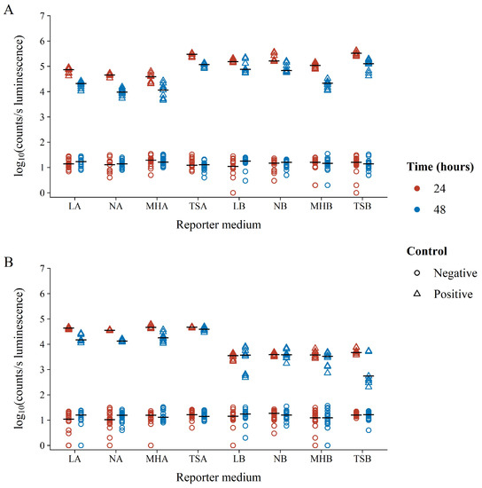 It has previously been suggested that this decrease is due to the depletion of available FMNH2 during the stationary phase [28]. Interestingly, S. aureus displayed similar luminescence at both 24 and 48 h of incubation in LB, NB, and MHB growth media. Unlike the negative controls (growth controls or no inhibition), positive control luminescence (blank or full inhibition) was unaffected by time, growth medium composition, or solidity. This is not surprising, as the absence of the luminescent reporter bacteria metabolism and, therefore, the absence of light is unaffected by other well contents. Therefore, positive control luminescence variability is only the consequence of instrument noise. This was further affirmed by our observation that even the measurement of a clean 96-well plate will result in the same luminescence background variability as compared to plates containing only a growth medium (results not shown).
