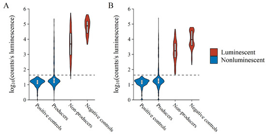 The co-culture nature of the assay adds additional complexity generally not present in other activity assays, most notably nutritional competition, variable antibacterial compound production, and varying growth rates of test versus reporter bacteria. This affected the luminescence of reporter bacteria in co-culture, unpredictably resulting in either decreased or even increased luminescence likely due to cellular stress, as compared to controls (Figure 3). Decreasing luminescence, therefore, should not be considered the only metric for the selection of antibacterial-producing test bacteria. However, the assay can be used to provide a binary yes or no answer as to whether reporter luminescence and, therefore, metabolism is detected or not, which in the case of the latter is inferred here as antibacterial compound production by the test bacterium. Figure 3 displays this binary nature clearly due to the separation between the luminescent distribution of reporter bacteria in co-culture with the 12 test bacteria that do and do not produce antibacterial compounds. The detailed results of the 12 test bacteria from which Figure 3 was constructed are provided in Figures S2 and S3 in the supplementary data. Although some of the known producer bacteria used to test the assay resulted in high luminescence, these observations were infrequent and were most likely due to the test bacterium either not producing or producing its respective antibacterial compound in too low quantities. The difference that antimicrobial production level has on the detection is clearly exhibited by the difference between the two surfactin producers in the test panel. B. subtilis ATCC21332, a wild type surfactin producer, is not a good producer and it does not always reliably produce surfactin. Compared to B. subtilis OKB105, a genetically manipulated high surfactin producer, B. subtilis ATCC21332 production was too low to exert inhibition above the selected cut-off (Table 1, refer to Figure 4). This highlighted that the BSLA assay was not only selected for antimicrobial producer bacteria, but specifically for good producers. Alternatively, the producer bacterium can itself produce bioluminescent pigments, but such bacteria are rare. To this effect, the assay could lend itself to some false-negative hits.