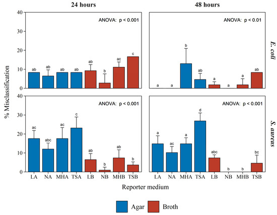 Furthermore, these results show that increased incubation time generally resulted in decreased E. coli misclassification rates, with the exception of the assays utilizing MHA as a reporter medium. Increased incubation time affected the misclassification rate of S. aureus to a lesser extent, resulting in a decrease only for NB and MHB reporter media. There was little difference between the misclassification of E. coli activity when comparing semi-solid and broth reporter media. However, a large discrepancy was observed between semi-solid and broth reporter media in the misclassification rates of activity toward S. aureus.