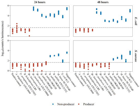 Similar to the negative controls (Figure 2), no clear optimal reporter medium could be distinguished, apart from broth media performing generally better (Figure 4). Therefore, any of the broth compositions used in this study can serve as a reporter medium in the BLSA assay. However, NB consistently, although not significantly, resulted in the lowest misclassification rate for both E. coli and S. aureus. Figure 5 displays the log10 luminescence of E. coli Xen14 and S. aureus Xen29 in the NB reporter medium following a 24 and 48 h test bacterium co-culture challenge. These results show a good distinction between producing and non-/weak-producing test bacteria.
