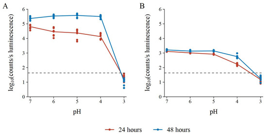 Furthermore, luminescence did not increase after 24 h of incubation. Therefore, we assumed reporter bacterium death at a pH equal to or less than 3. Interestingly, the luminescence of both reporter bacteria decreased as pH decreased after 24 h of incubation. However, at 48 h of incubation, the luminescence at a lower pH returned to that of the luminescence at pH 7. The exception was S. aureus at a pH of 4, which did not return to the baseline luminescence. However, with longer incubation times, the luminescence might increase back to baseline.