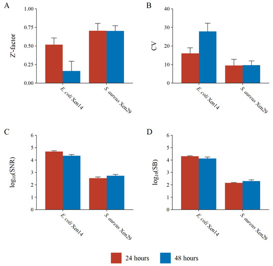 High-throughput assay quality measures including the (A) Z’-factor, (B) coefficient of variation of the maximum signal (negative controls), (C) signal-to-noise ratio, and (D) signal-to-background ratio for the reporter bacteria E. coli Xen14 and S. aureus Xen29 at 24 and 48 h of incubation.